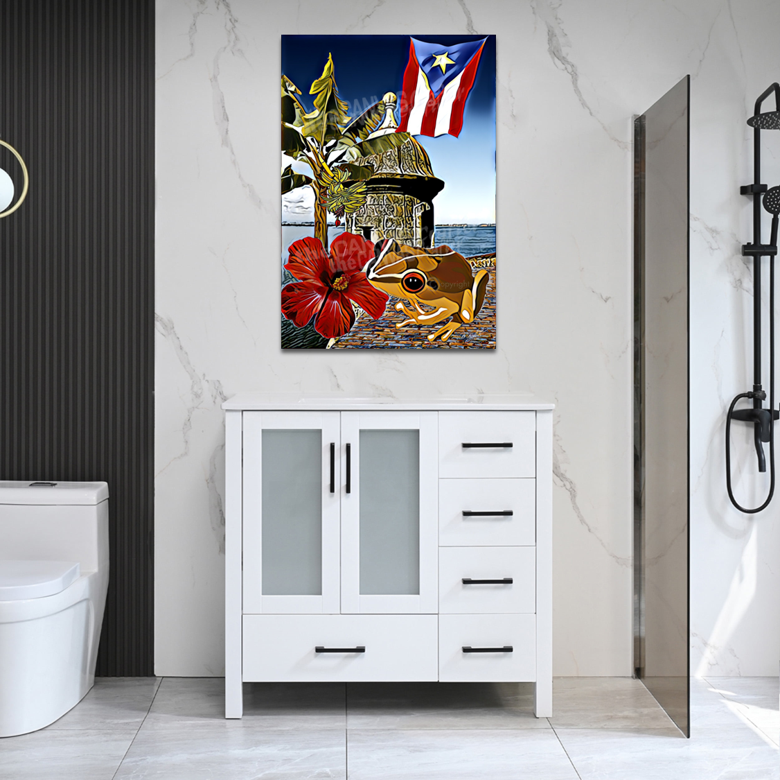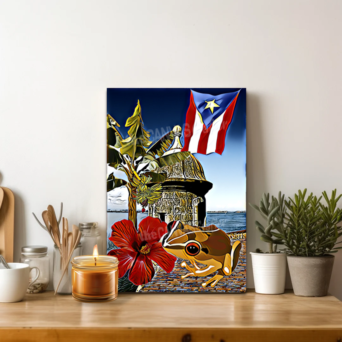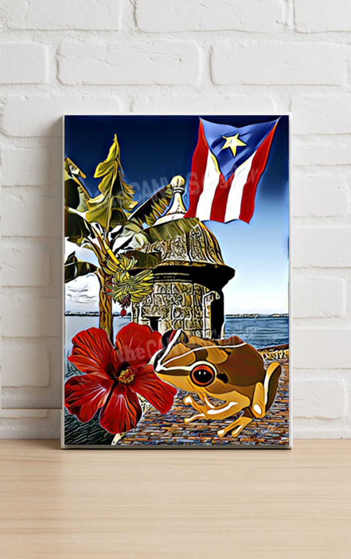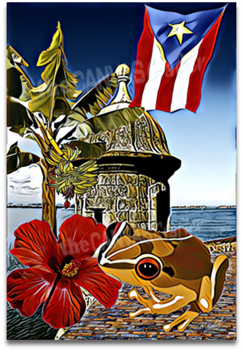 Esta pintura tiene integrado varios símbolos o iconos de Puerto Rico como lo son: el Coqui, el Plátano, el paisaje del Castillo del Morro y la Flor de Maga